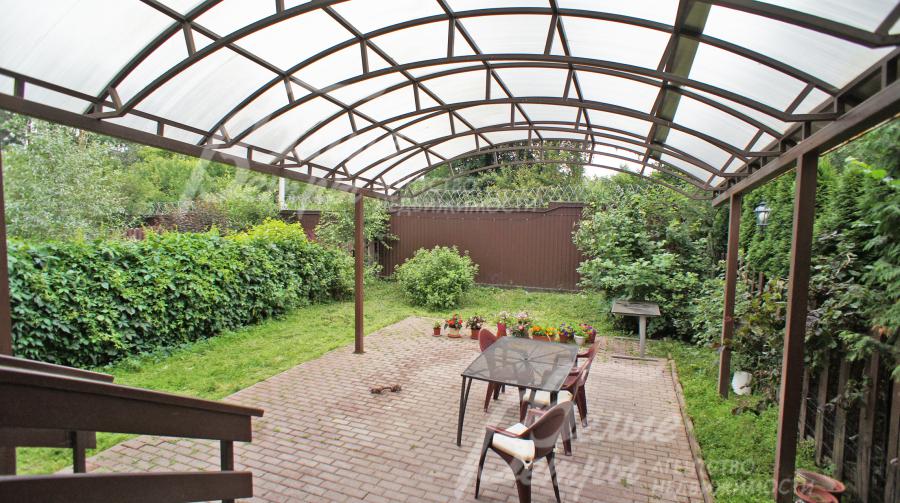 Дополнительные строения: Навес с полусферической поликарбонатовой прозрачной крышей на металлическом корпусе на заднем дворе и площадка под ним из брусчатки, перед главным входом навес для парковки на 2 машиноместа.