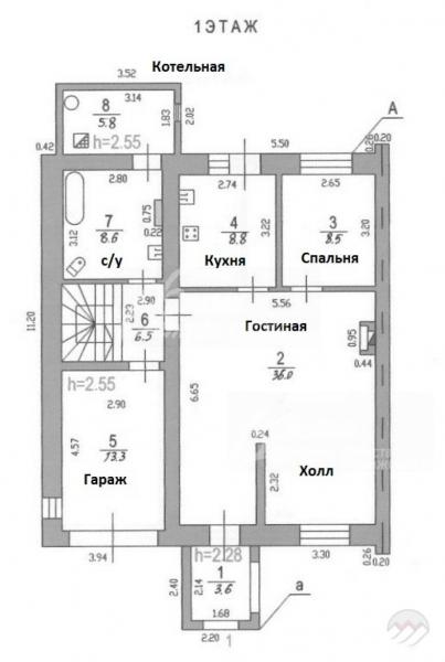 1-ый этаж: прихожая, холл-гостиная 36 кв.м, кухня 9 кв.м, спальня 8.5 кв.м, с/узел 8 кв.м; котельная 6 кв.м, гараж 13 кв.м