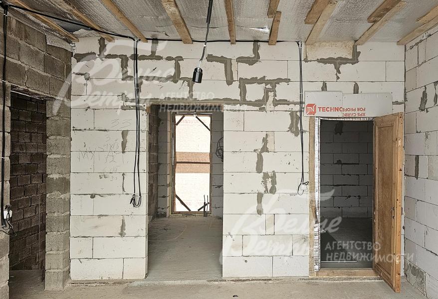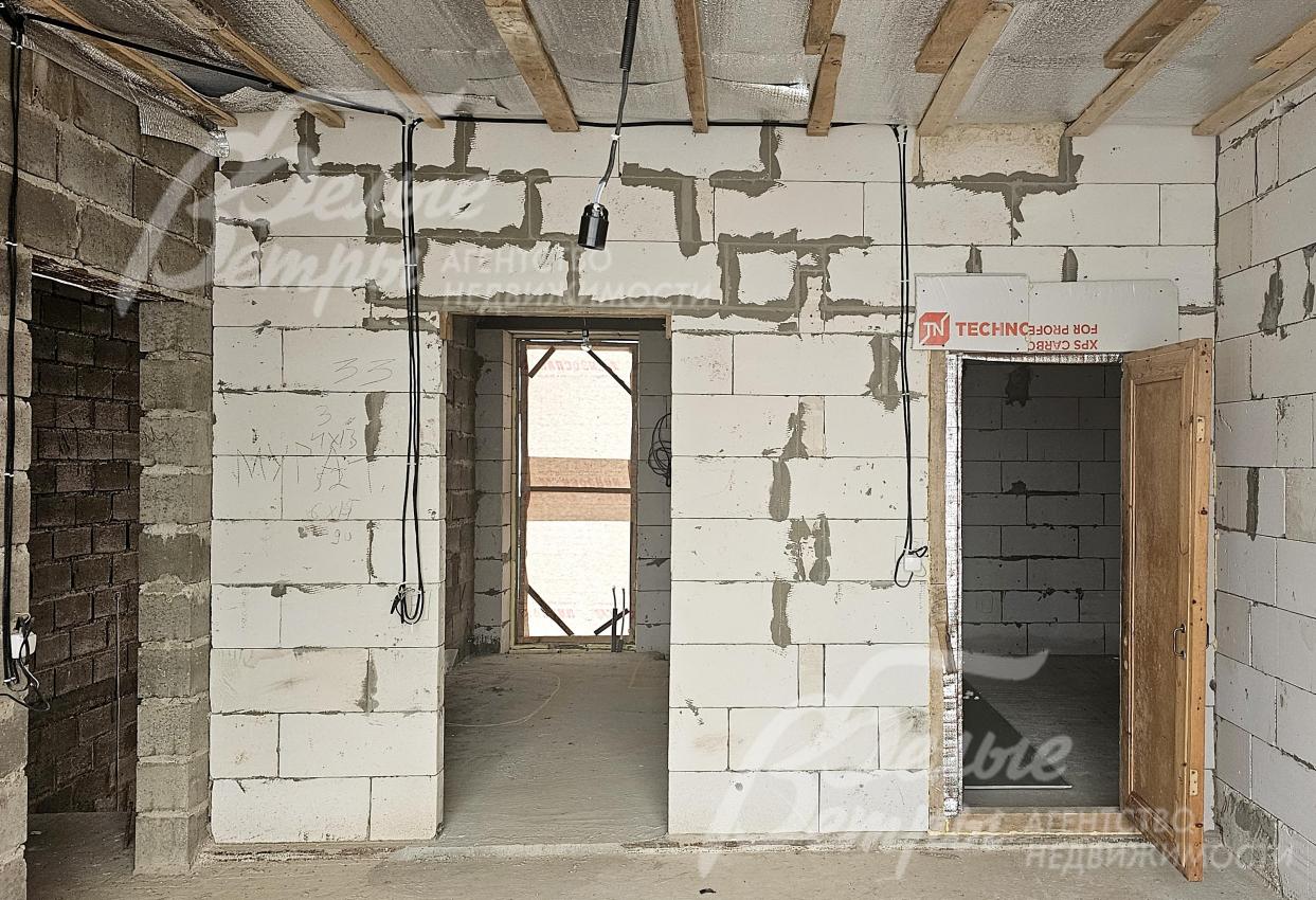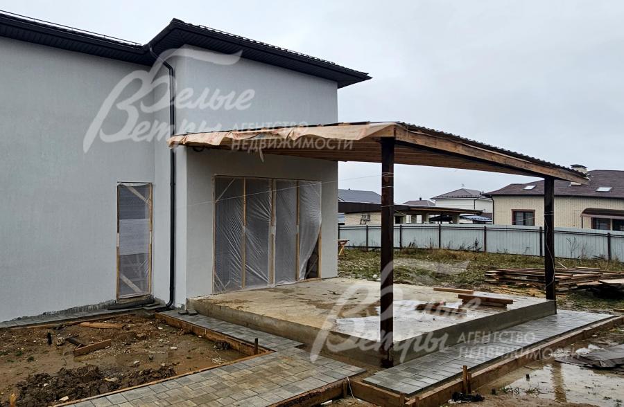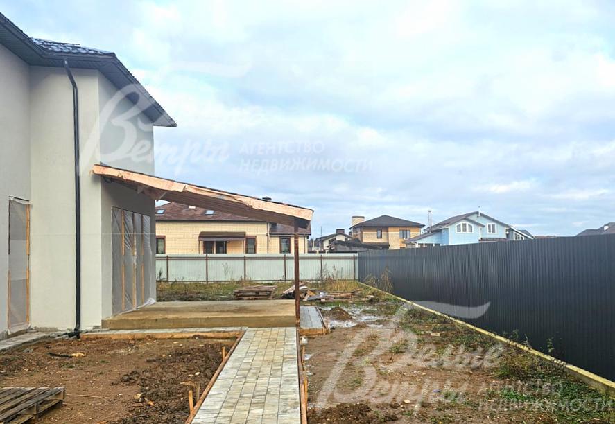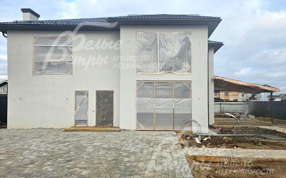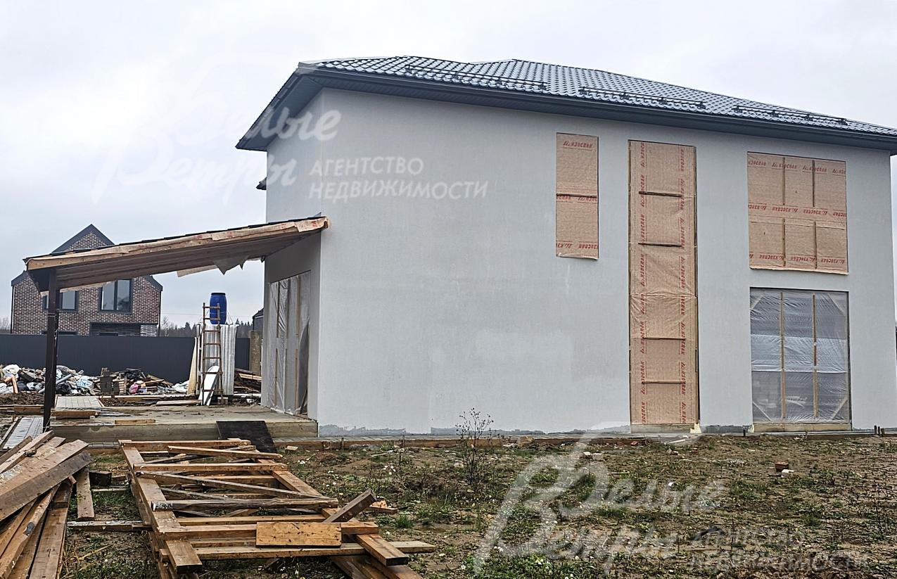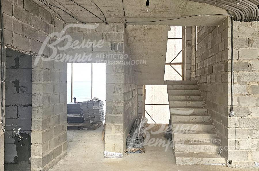 На участке построен дом в современном классическом стиле под чистовую отделку (год постройки – 2025): готовая «коробка» с кровлей, фасадом, внутренними перегородками и заведенными коммуникациями. Общая площадь дома составляет 235 кв.м, включает два этажа и террасу. Несущие стены возведены из газобетонных блоков размером 40×20×60 мм с наружным утеплением толщиной 50 мм, внутренние перегородки изготовлены из прочных пескоцементных блоков. Фундамент – лента в сочетании с плитой, заглубленной на 1,5 метра, межэтажные перекрытия – монолитные. Фасад отделан декоративной штукатуркой «короед» производства VGT. Кровля смонтирована из металлочерепицы с утеплением перекрытия толщиной 200 мм, дополнена снегозадержателями и металлической водосточной системой. Внутри – монолитные бетонные полы и потолки, железобетонная лестница. Выполнено утепление чердачного перекрытия по полу. Все основные коммуникации разведены до точек потребления — проведены системы электроснабжения, водоснабжения и канализации. В планировке на 1-м этаже – холл 16 кв.м, лестничный проём 8,5 кв.м, кухня-столовая 22 кв.м, гостиная 20 кв.м, спальня (кабинет) 17 кв.м, санузел 5,5 кв.м, бойлерная 6 кв.м, терраса 22,5 кв.м; на 2-м этаже – холл, мастер-спальня 22 кв.м с санузлом и гардеробной 12,5 кв.м, спальня 23,5 кв.м, спальня 15 кв.м, санузел. Высота потолков (в черновом варианте) на 1-м этаже – 2,96 м, на 2-м этаже – 2,9 м. Все находящиеся в доме материалы остаются.