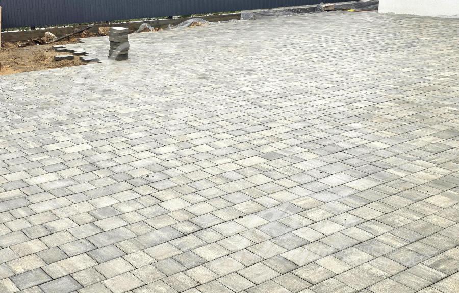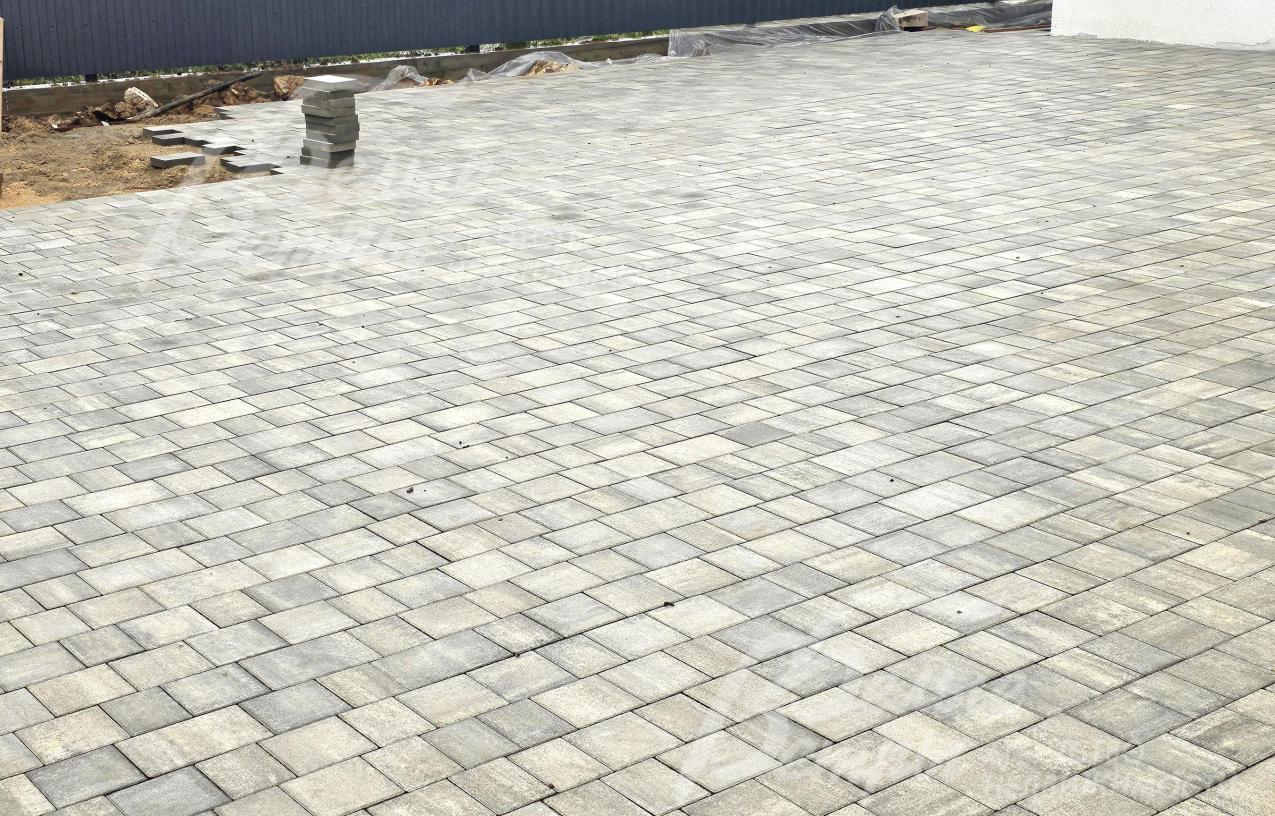 Благоустройство участка: участок освобождён от деревьев и выровнен. Выполнена укладка брусчатки: оборудована парковка перед домом и проложены дорожки