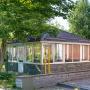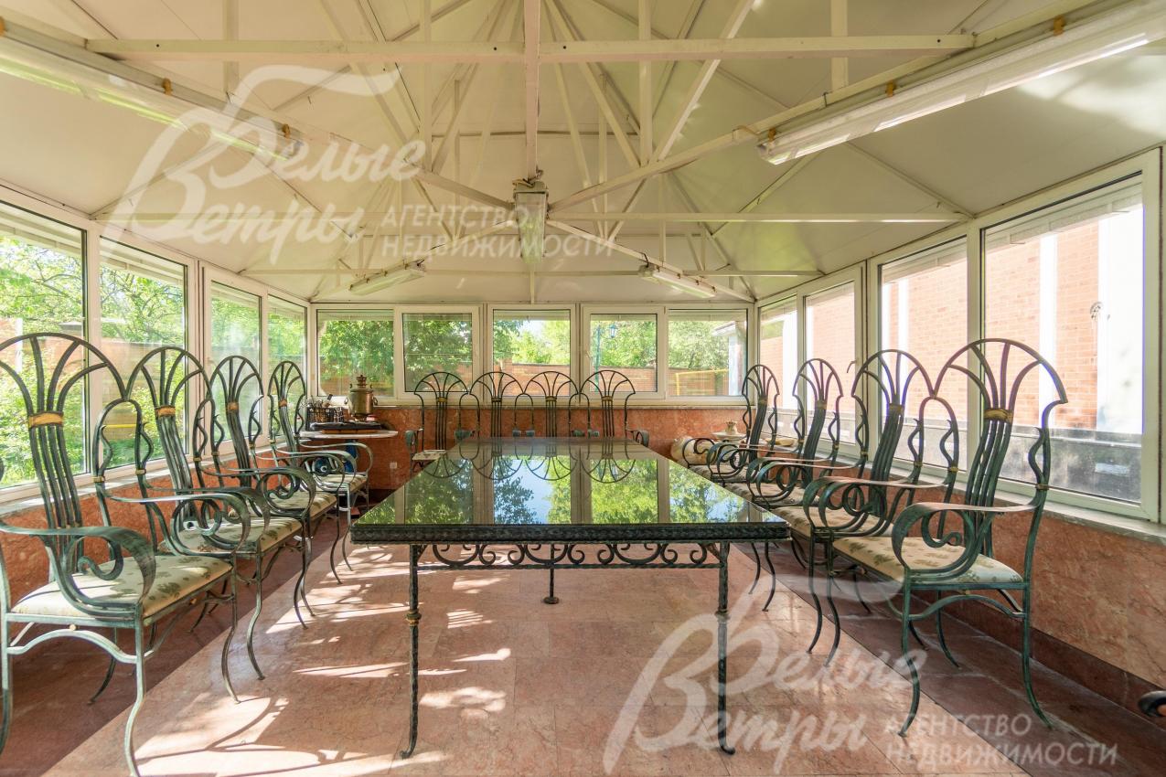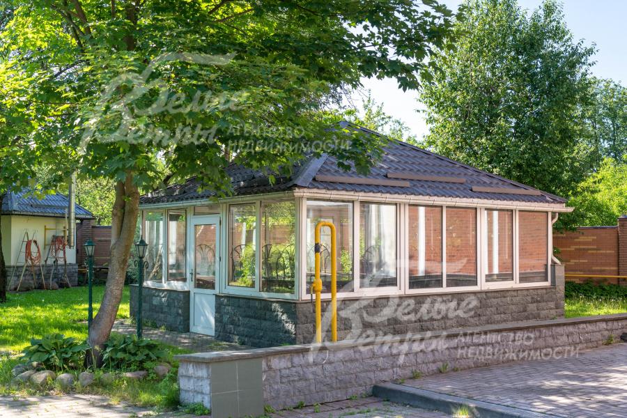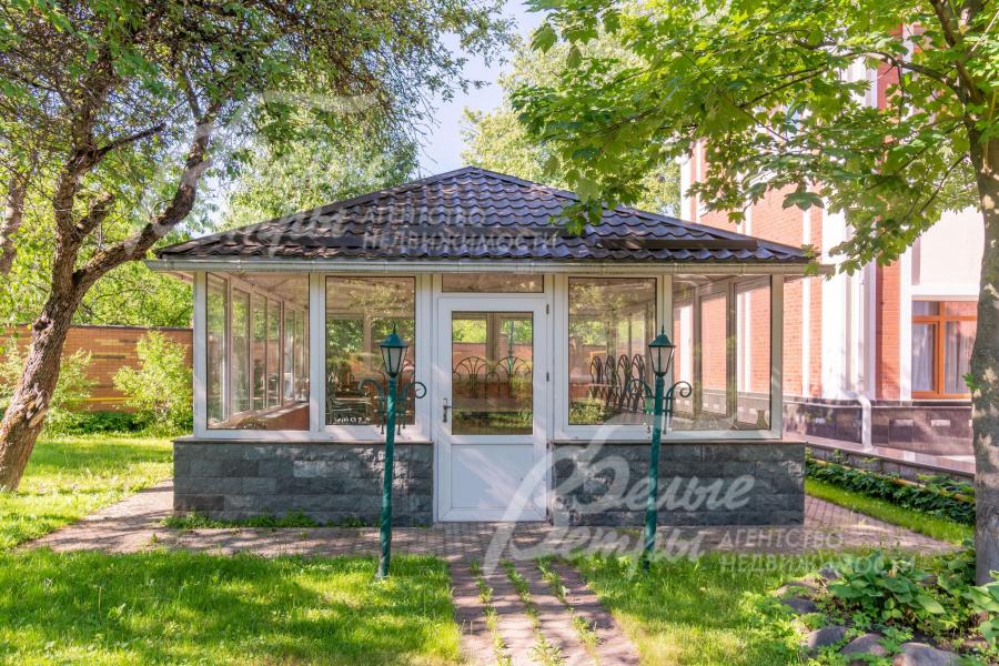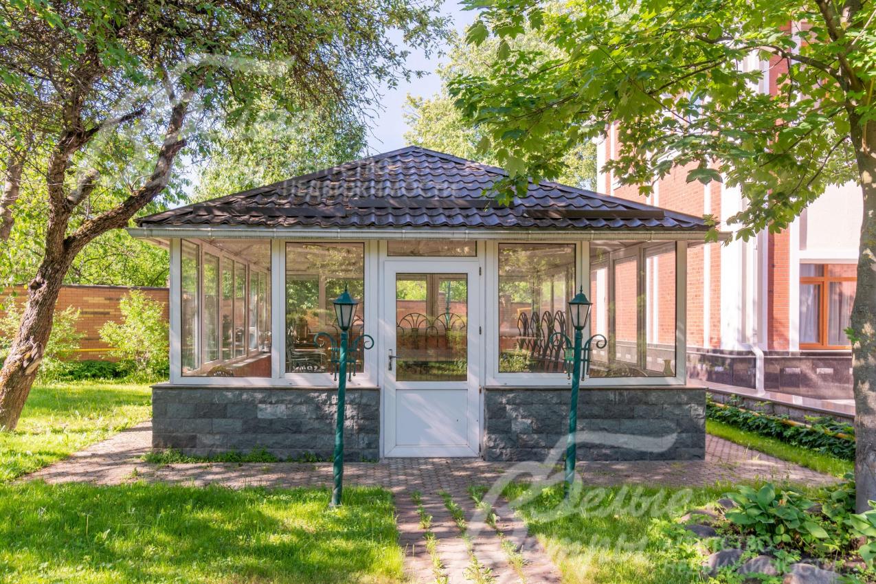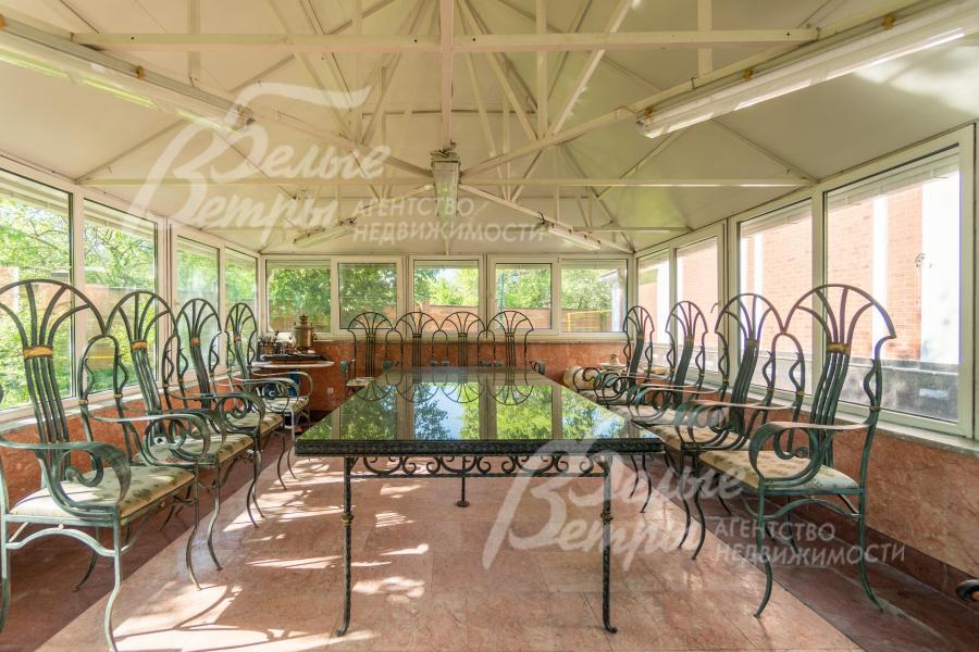- Застекленная беседка-павильон. Отделка фасада: цоколь - гранитная плитка. Внутри огромный стол с гранитной столешницей и огромные кованные из металла стулья.